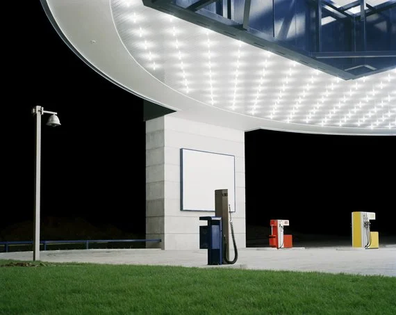 I’m currently looking a lot at images like this, which are in a kind of hybrid state between the hyperreal and the abstract, between fact and fiction. It is perhaps not this particular photograph by Julian Faulhaber that fascinates me, but rather the type of photography it represents, images that with crystal clear sharpness depict something with a detailed and zealous attention and yet does not really reveal anything. The image is as expressive as an architectural rendering and I find it both repulsive and attractive this lack of signs or clues. I don't quite know where to fix my gaze in this image, it sweeps over the polished surfaces in search of a little friction, for a rustle on the ground, a withered strand of grit, a crack in the perfection, until it is finally sucked into the darkness somewhere behind the petrol pumps. I’m trying very hard to get into a place I don't really want to be.
