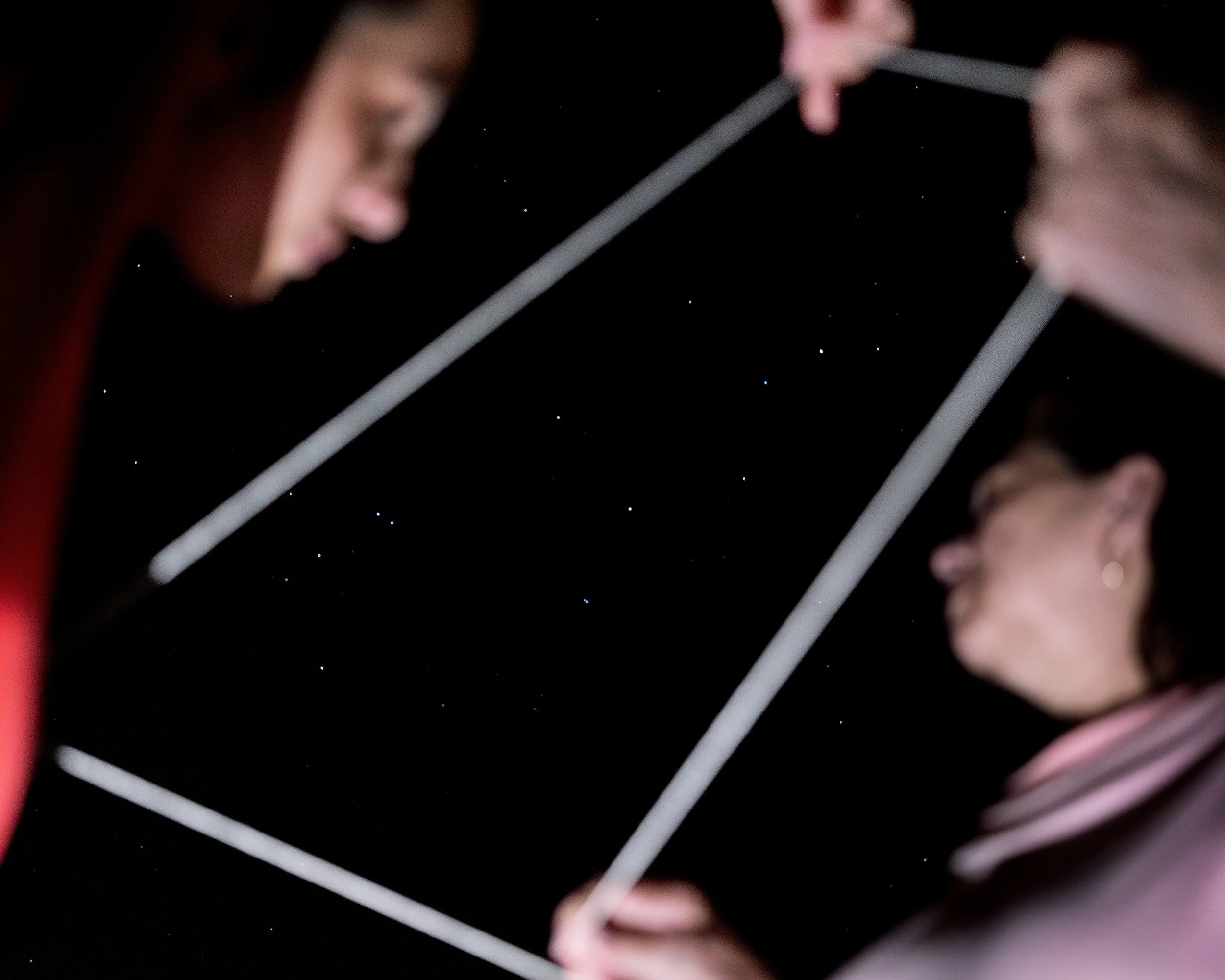 It was during that talk, watched via my iPhone on the train, that I saw Báez’s remarkable image Constellation. The image features the artist and her mother mapping the sky with string, framing the cosmos and together flattening the distance between earth and sky. Shot from below, the photograph has soft, cloud-like edges that create a corporeal sense of being physically pulled up into the image and beyond.