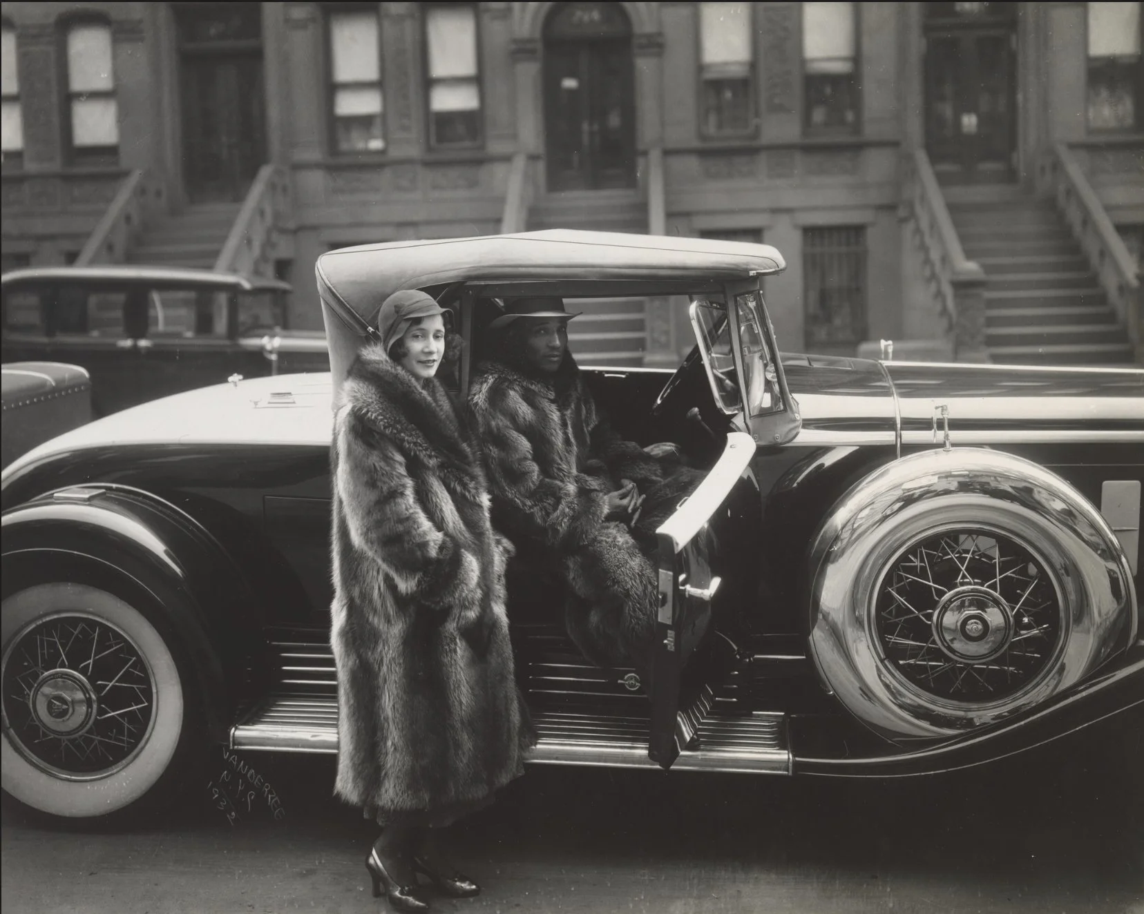 When I think of James Van Der Zee, a photographer popular during the Harlem Renaissance, I appreciate how he created a record, or counter-narrative, to the stereotypes about Black people at the time. In his photographs, the subjects—most often Black Americans—and the locations and clothing (what I like to call costumes) serve as markers for other things, like status. The car functions as a prop and feels powerful because it takes up almost the entire frame. It cuts through, making the subjects important. They feel safe. The light is very soft, and the car door is open just enough to welcome me into that space. These people seem to be inviting the viewer into an important space.